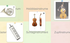 Ordne die Instrumente den richtigen Instrumentenfamilien zu. Wenn du nicht weisst, wie ein Instrument heisst, kannst du das kleine „i“ am Bildrand berühren bzw. darauf klicken.